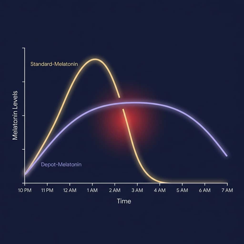 Und dann das, was er als „den entscheidenden Unterschied“ bezeichnete: Depot-Melatonin mit zeitverzögerter Freisetzung. 1,9 Milligramm – eine Dosierung im natürlichen Bereich, die der Körper auch selbst produziert. Aber anders als Standard-Melatonin, das schnell ansteigt und nach 1–2 Stunden abstürzt, gibt Depot-Melatonin den Wirkstoff über 6 Stunden gleichmäßig ab.