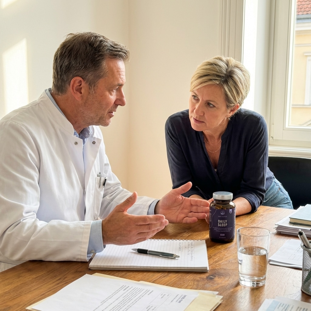 Aber statt mir einfach zu sagen „Nehmen Sie das, dann schlafen Sie“, tat der Arzt etwas anderes. Er erklärte mir genau, wie Daily Sleep an jeder der drei Blockaden arbeitet. Und zum ersten Mal klang eine Erklärung nicht wie ein Werbeversprechen – sondern wie Biologie.