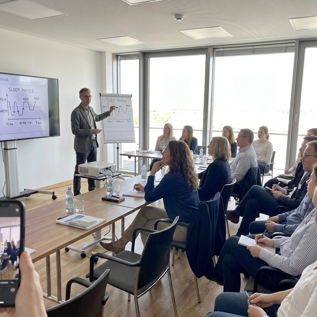 Der Referent erklärte, dass unser Körper in einer normalen Nacht durch verschiedene Schlafphasen zykliert: Leichtschlaf, Tiefschlaf und REM-Schlaf. Jede Phase hat eine Aufgabe.