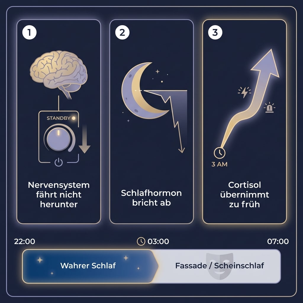 Blockade #3: Cortisol übernimmt die zweite Nachthälfte. Wenn Melatonin abfällt, schießt das Stresshormon zu früh hoch. Ab 3 Uhr beginnt das, was Experten eine „hormonelle Frühschicht“ nennen: Ihr Körper startet das Aufwach-Programm, obwohl Sie noch 4 Stunden Schlaf vor sich hätten. Die letzten Stunden Ihrer Nacht sind nur noch Fassade.
