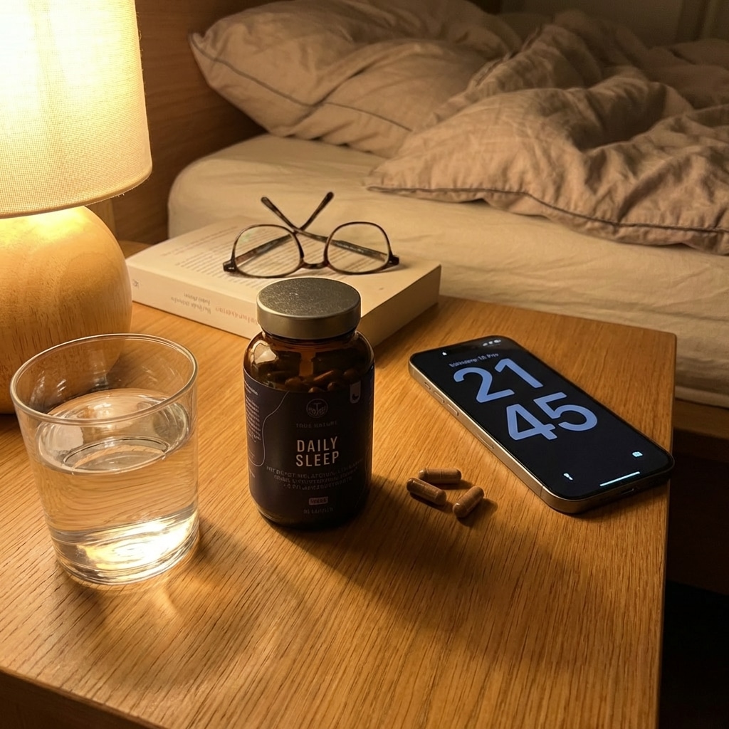Alle Inhaltsstoffe sind Stoffe, die Ihr Körper bereits kennt: GABA produziert Ihr Gehirn selbst. Tryptophan essen Sie täglich. Melatonin – 1,9 mg im physiologischen Bereich – bildet Ihr Körper jede Nacht. Die Pflanzenextrakte trinken die meisten als Tee. Keine Fremdchemie. Keine Abhängigkeit. Keiner dieser Stoffe überschreibt Ihr Nervensystem – sie unterstützen es nur.